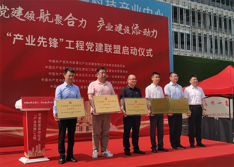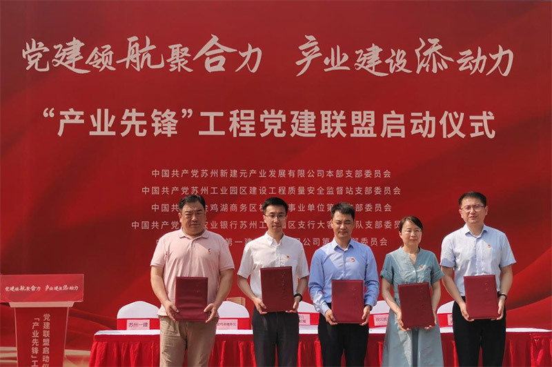 6月13日上午,由苏州新建元产业党委牵头,联合园区质安站、金鸡湖商务区、农业银行园区支行、苏州一建共5家单位组成的“产业先锋”工程党建联盟启动仪式在阳澄数谷新建元项目部成功举办。